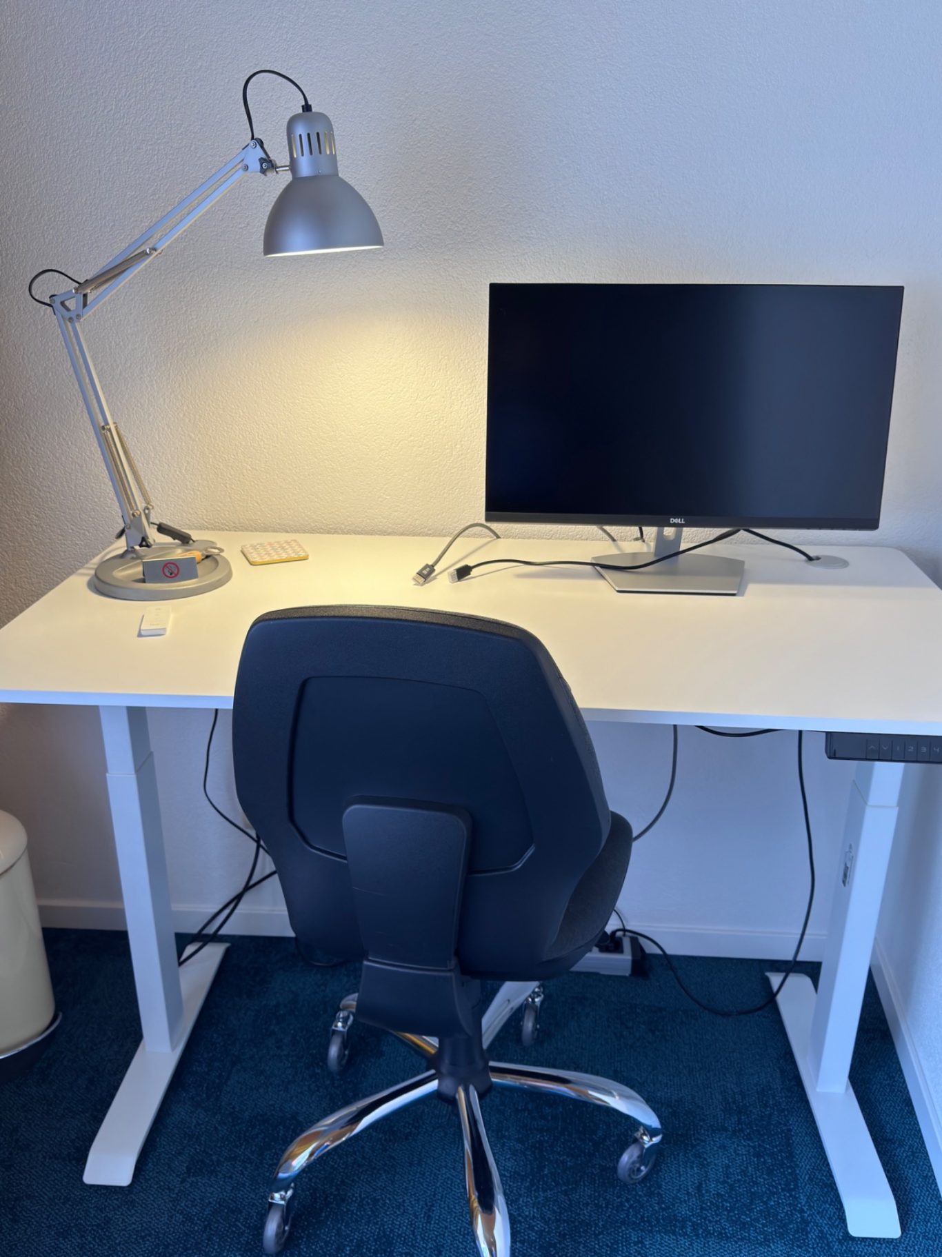 - Einen Arbeitsplatz mit elektrisch höhenverstellbarem Schreibtisch und Bürostuhl